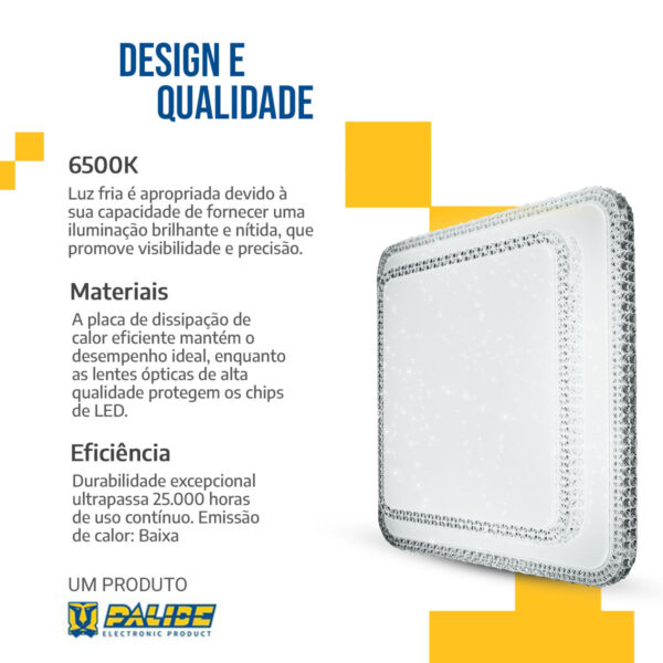 O lustre cristal led 43×43 é a síntese perfeita entre luxo decorativo e iluminação inteligente. Logo na introdução, destaca-se sua elegância com bordas de cristal e a praticidade da multitemperatura ativada por interruptor.