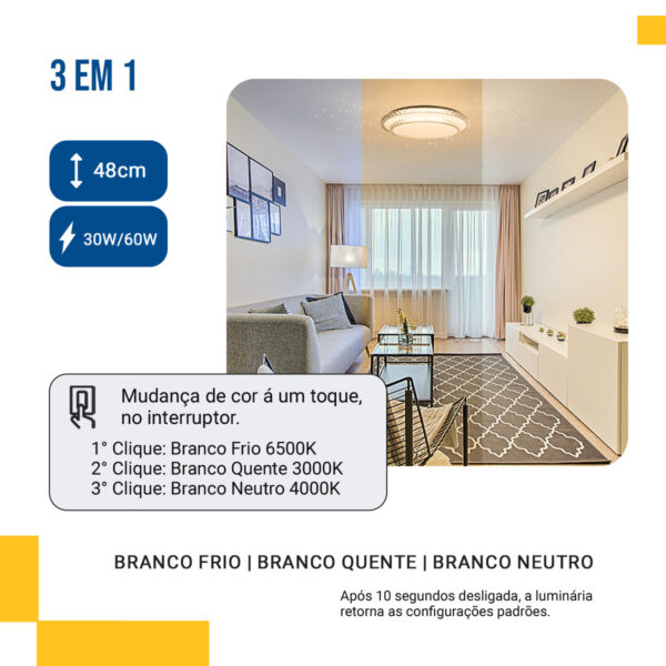 O lustre cristal led 48cm combina sofisticação e tecnologia, transformando qualquer ambiente com sua borda de cristal e efeito estrelado. Logo na introdução, destaca-se seu design decorativo e a facilidade de alternar temperaturas de luz via interruptor, sem controles extras.