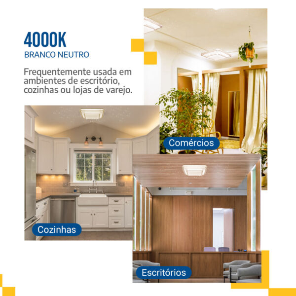 Você alterna facilmente entre branco frio, neutro e quente, adaptando o ambiente conforme o momento. Assim, ambientes de trabalho recebem luz fria, áreas sociais ganham luz neutra e espaços de descanso ficam mais aconchegantes com luz quente. Além disso, mantém baixo consumo, ideal para uso contínuo. Portanto, alia versatilidade e eficiência.