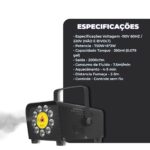 Além disso, o controle remoto sem fio oferece liberdade total de movimento, permitindo que você ative luzes e fumaça à distância com precisão. Assim, você ganha agilidade e charme na apresentação sem complicações. Enquanto isso, o reservatório de 350 ml proporciona autonomia prolongada, sendo especialmente vantajoso em eventos longos, já que o consumo gira em torno de 7,5 ml/min.