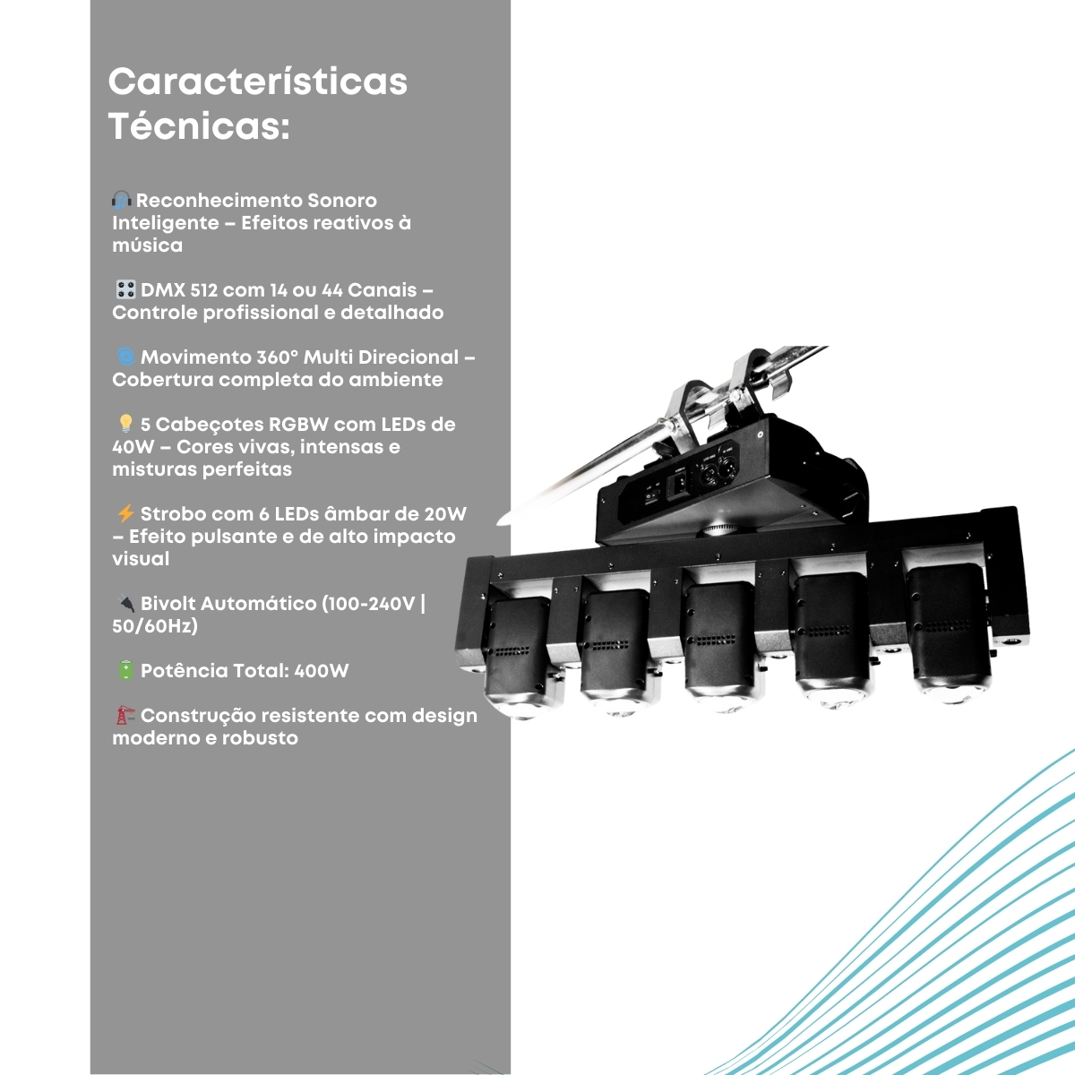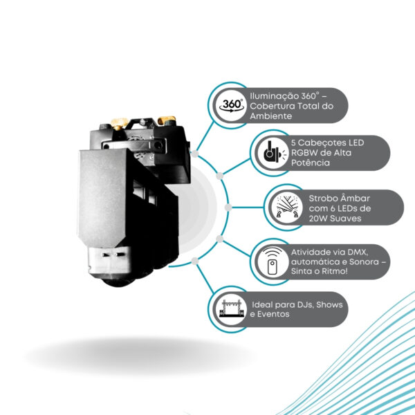 Outro diferencial é sua iluminação 360° multi direcional, composta por cinco heads móveis RGBW que cobrem todos os ângulos. Além disso, o strobo âmbar independente com seis LEDs de 20W proporciona flashes potentes para momentos de destaque.
