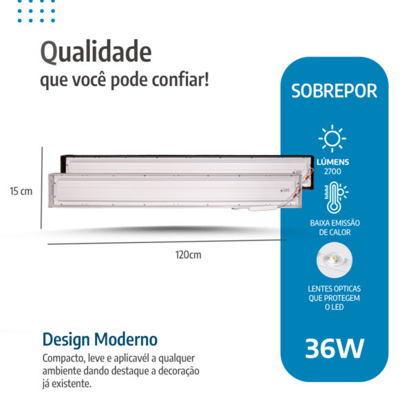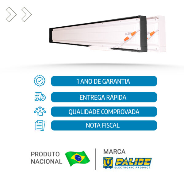 Com dimensões compactas de 120×15 cm e borda de 4 cm, o painel encaixa-se perfeitamente em forros de gesso, madeira, PVC ou modulares. Além disso, ele vem completo com driver, fixadores e instruções. Portanto, a instalação é rápida e descomplicada, sem reformas extensas.