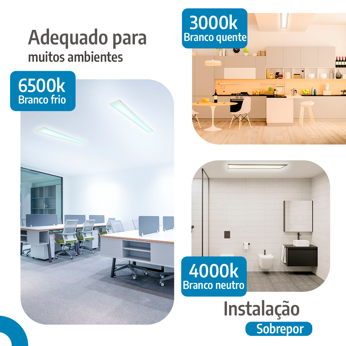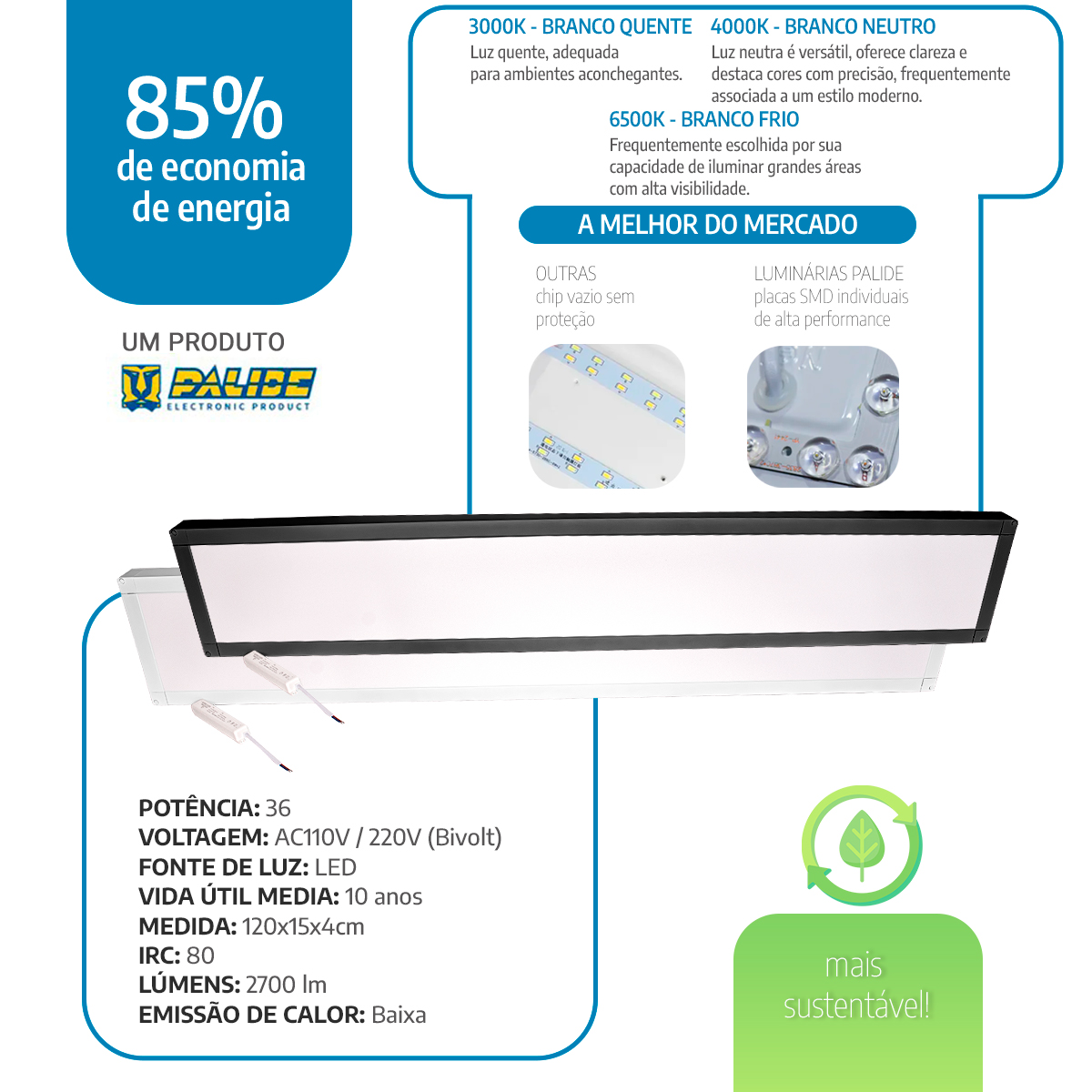 Com fluxo luminoso de 3.600 lúmens e temperatura de cor blanco neutro (4000 K), o painel garante iluminação clara e confortável. Dessa forma, melhora a visibilidade em escritórios, salas, corredores, cozinhas e áreas comerciais. Além disso, ele une conforto visual com funcionalidade técnica.