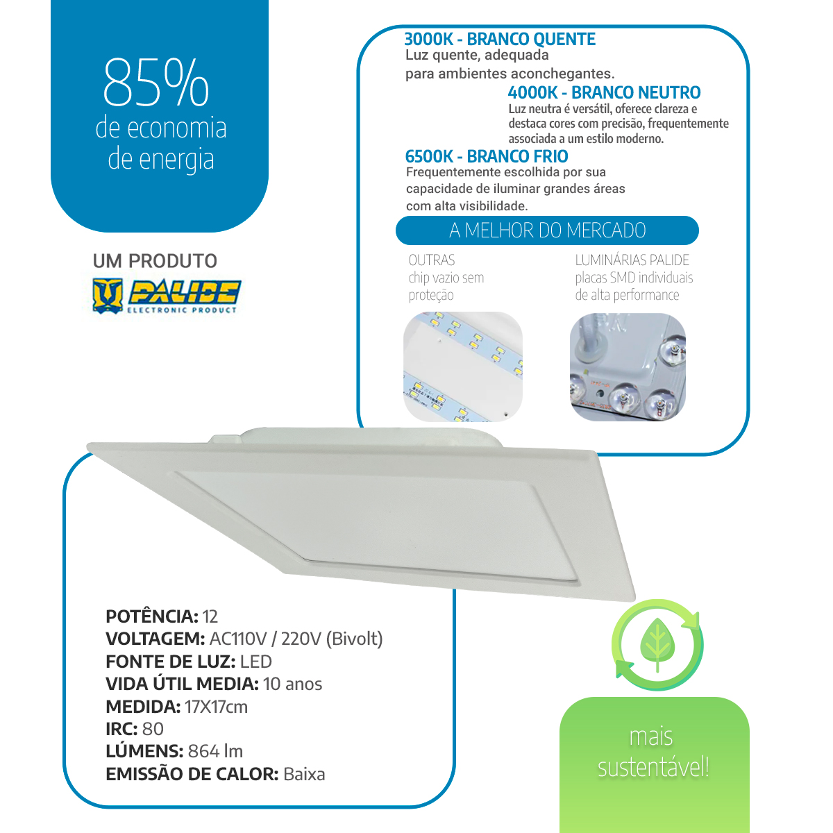 O painel led 17×17 embutir da Palide combina design moderno, eficiência luminosa e baixo consumo. Antes de tudo, ele oferece ótima iluminação com apenas 12 W, sendo ideal para ambientes compactos como cozinhas, banheiros, escritórios e recepções. Além disso, seu formato redondo e discreto se encaixa facilmente em projetos elegantes e funcionais.