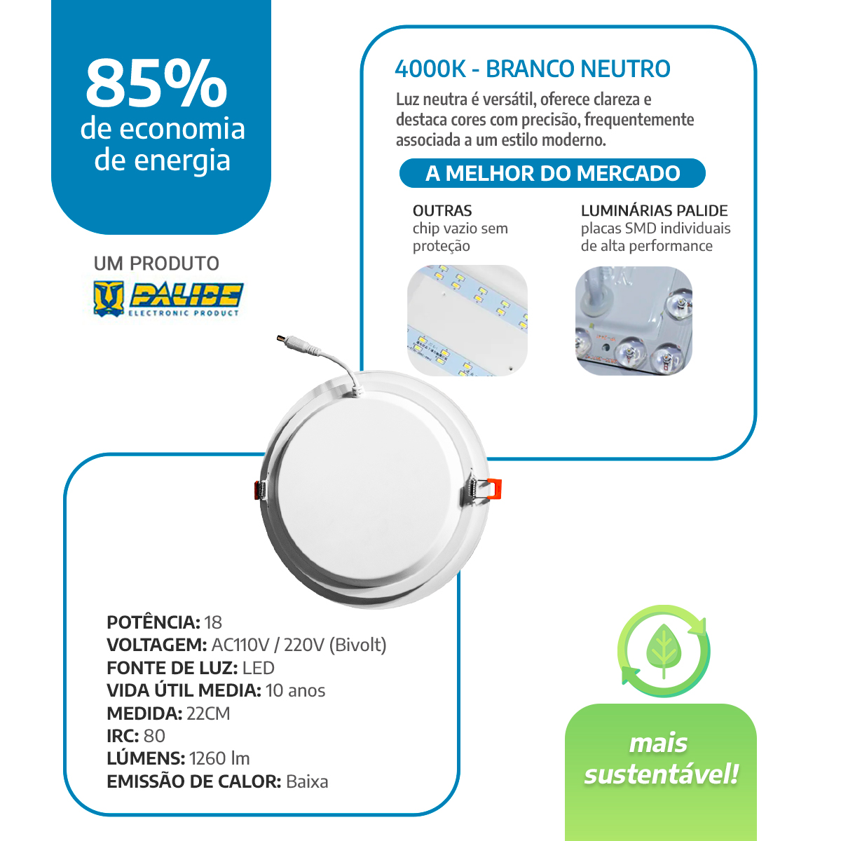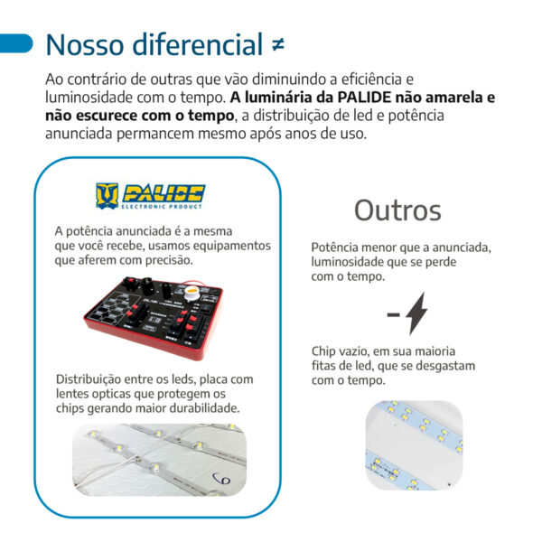 Esse painel permite economia de até 85% em energia comparado a lâmpadas tradicionais. Em outras palavras, ele combina iluminação de qualidade com menor impacto no bolso e no meio ambiente.