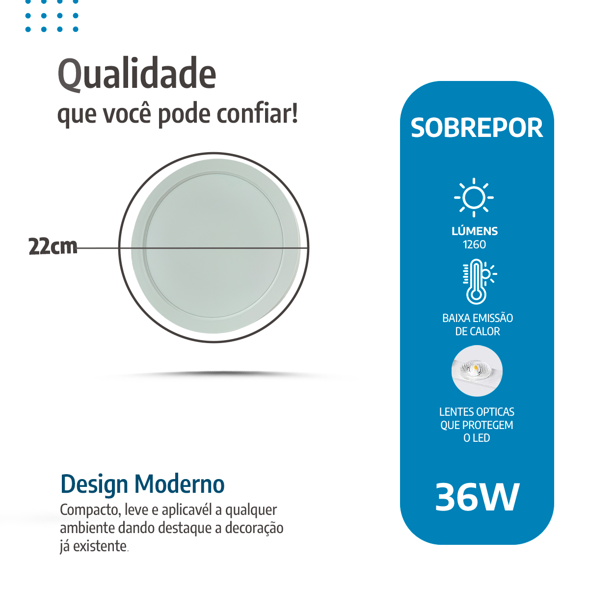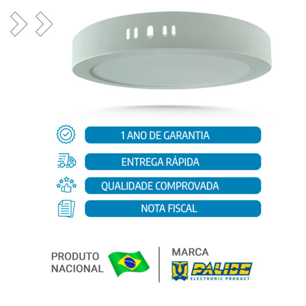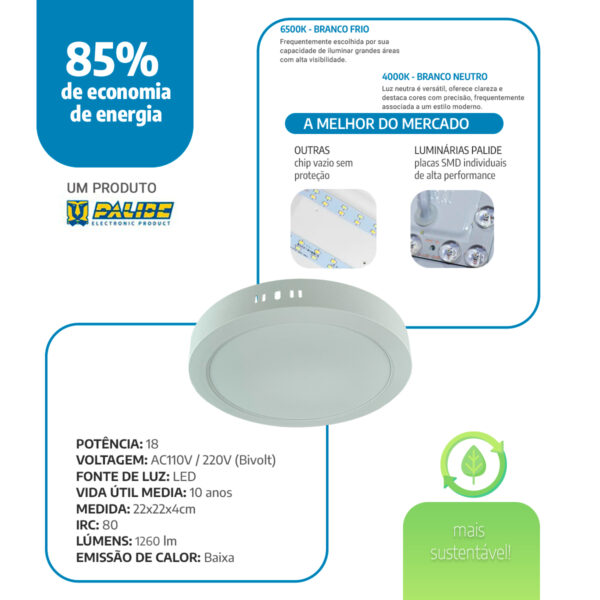 O painel led 22cm sobrepor da Palide entrega iluminação moderna com baixo consumo e excelente acabamento. Antes de tudo, o formato redondo 18W ocupa pouco espaço visual e se integra bem a cozinhas, banheiros, consultórios, lojas e escritórios. Além disso, a construção com placa SMD e lentes ópticas individuais distribui a luz de forma uniforme, garantindo conforto visual e durabilidade.