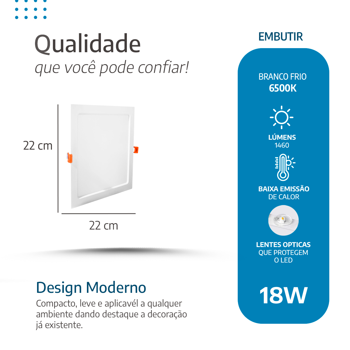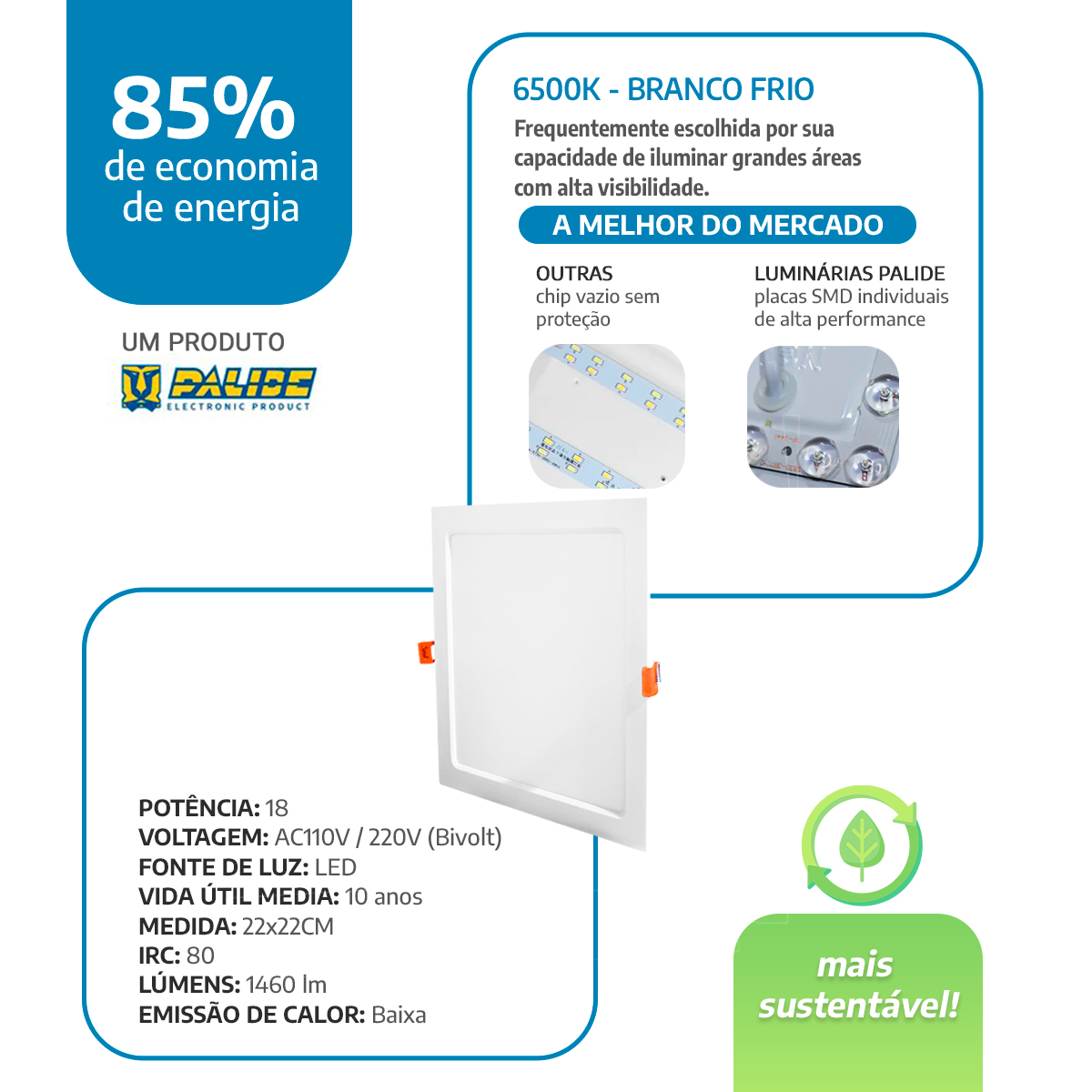 O painel LED 22×22 da Palide oferece iluminação moderna, econômica e duradoura. Primeiramente, ele une alto brilho com baixo consumo de energia. Além disso, com apenas 18W de potência, emite 1460 lúmens de luz uniforme, garantindo ambientes claros e confortáveis. Portanto, você gasta menos e ilumina mais.