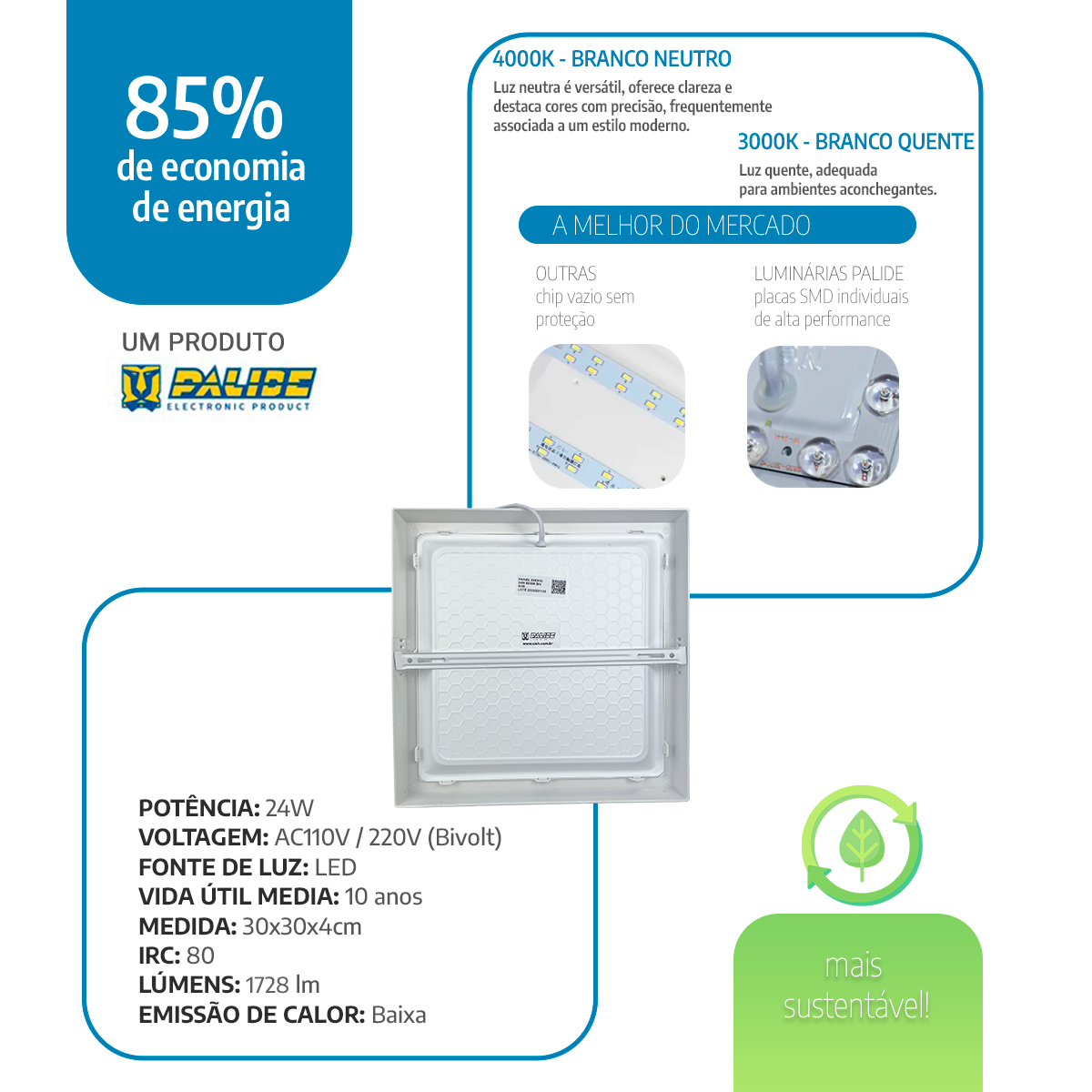 O painel led 30×30 sobrepor quadrado da Palide oferece uma solução elegante para quem busca iluminação eficiente, estética moderna e instalação fácil. Antes de tudo, seu design clean se adapta a residências e espaços comerciais com sofisticação. Além disso, ele une praticidade e desempenho com apenas 24 W de potência.