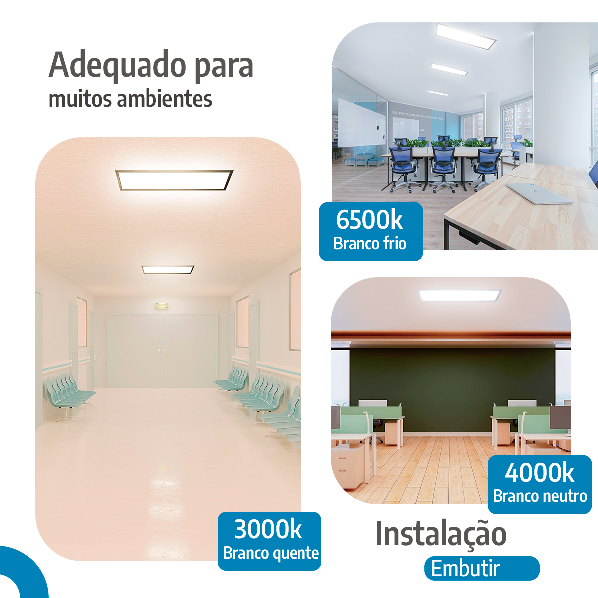 A tecnologia de lentes ópticas e a disposição precisa dos LEDs garantem luz homogênea, sem falhas ou pontos escuros. Portanto, a iluminação torna o ambiente mais agradável aos olhos e aumenta o conforto visual em atividades prolongadas. Dessa forma, escritórios, hospitais e salas de reunião ganham equilíbrio e qualidade de luz.