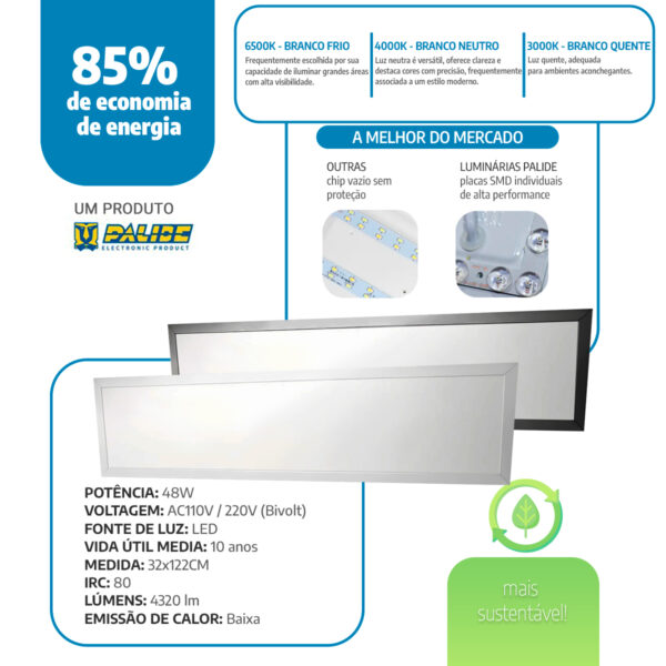 Com 48 W de potência e 3.600 lúmens reais, o painel entrega desempenho superior. Além disso, você pode verificar tanto a potência quanto o fluxo luminoso com luxímetro e wattímetro, o que assegura precisão e confiabilidade. Ou seja, você sabe exatamente o que leva para o seu espaço.