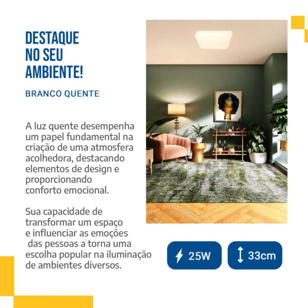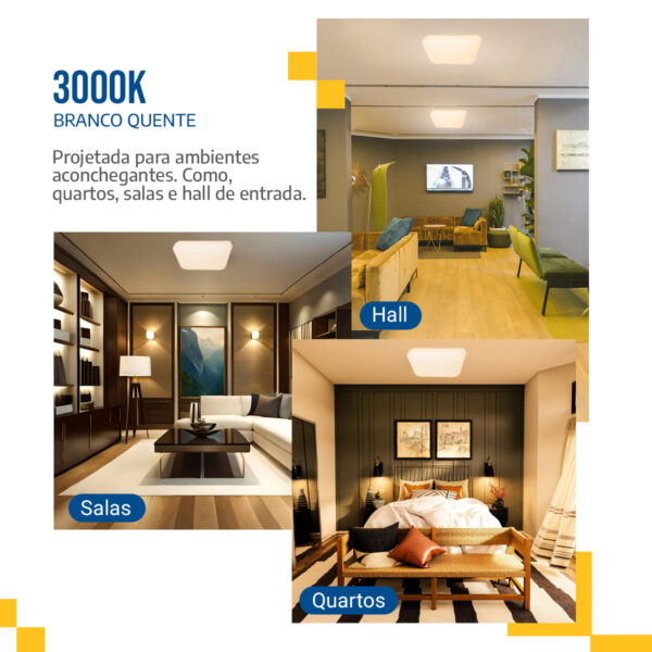 Esse plafon led 33×33 sobrepor permite alternar entre branco frio (6500 K), neutro (4000 K) e quente (3000 K) com facilidade, por meio de um simples interruptor. Assim, adapta-se ao momento: perfeito para foco em cozinhas ou banheiros, conforto em salas ou escritórios e relaxamento em quartos. Além disso, entrega desempenho e durabilidade com 25 000 horas de vida útil, tornando-se uma escolha inteligente.