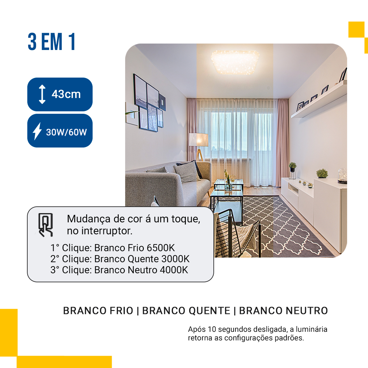 Esse plafon led 43×43 multicor combina estética moderna e funcionalidade, pois oferece 3000 K, 4000 K e 6500 K com um simples toque no interruptor. Assim, torna-se ideal para criar atmosferas aconchegantes, produtivas ou relaxantes de forma prática. Além disso, entrega economia real, já que sua durabilidade chega a 25.000 horas de uso. Portanto, é uma escolha inteligente para quem busca eficiência e qualidade.