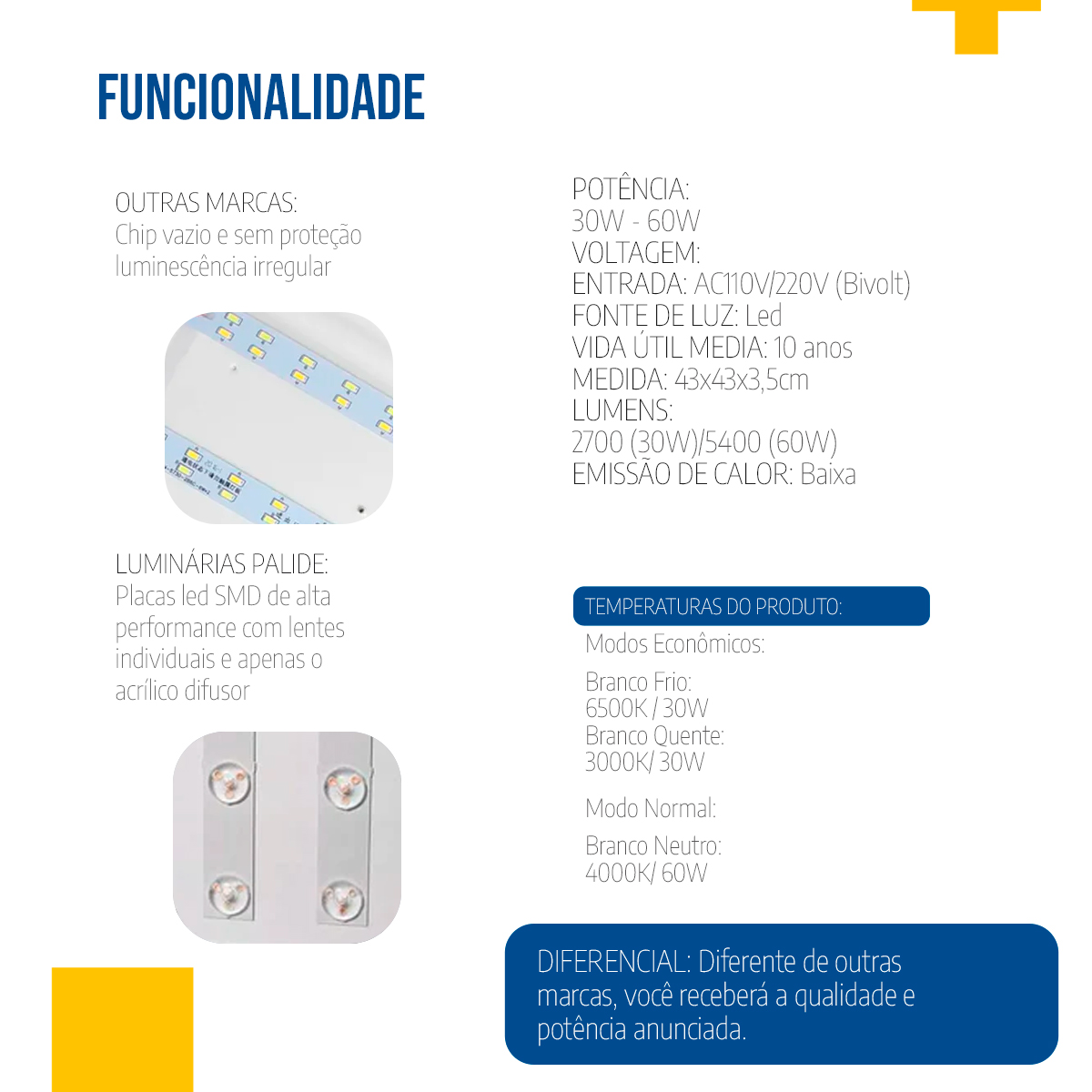 O acabamento branco e o perfil de sobrepor valorizam qualquer estilo decorativo, seja clássico ou contemporâneo. Além disso, o plafon led 43×43 multicor utiliza tecnologia LED de alta eficiência, oferecendo até 5.400 lm (60 W) sem comprometer o consumo. Assim, o produto mantém baixo gasto energético. Ele apresenta IRC > 80, o que contribui para uma iluminação mais fiel às cores reais do ambiente.