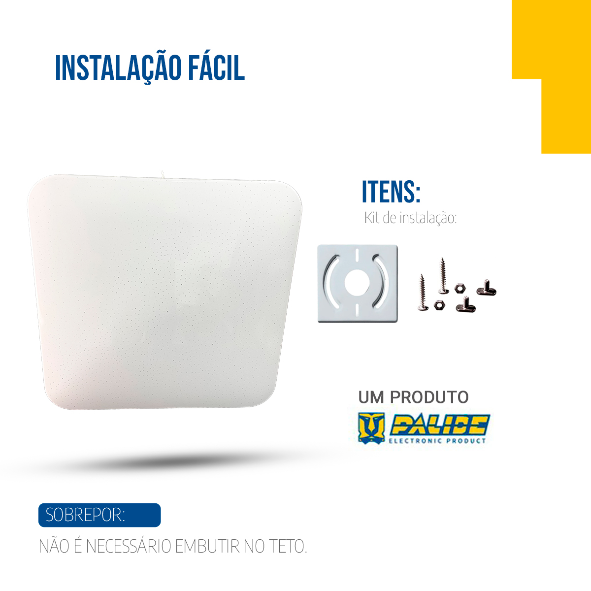 Instalação: sobrepor com fixação simples; conexões elétricas básicas em bivolt (110–220 V).